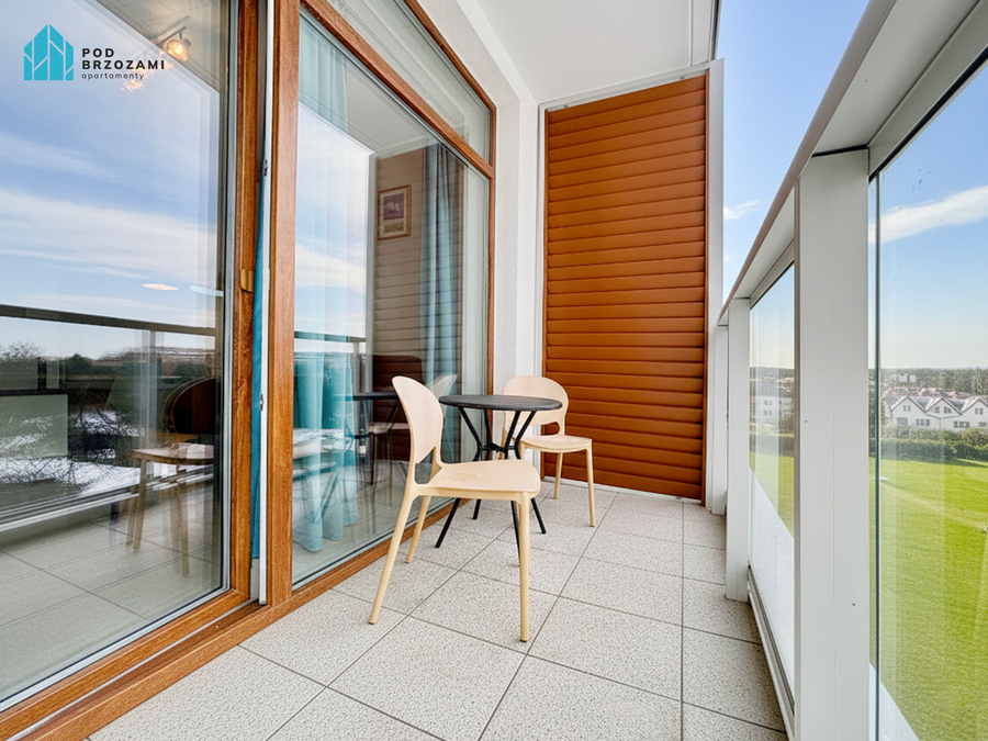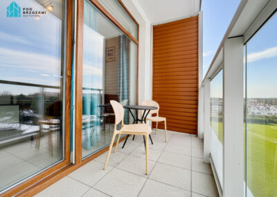 Balkon z widokiem na panoramę okolicy oraz meblami tarasowymi to idealne miejsce na poranną kawę, wieczorny chillout czy rodzinne śniadanie na świeżym powietrzu.